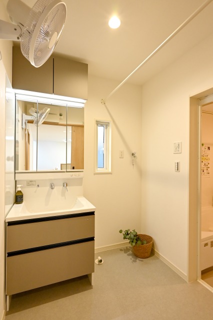 ▽淡色でまとめた優しい雰囲気の洗面脱衣室には、ご希望で扇風機を設置