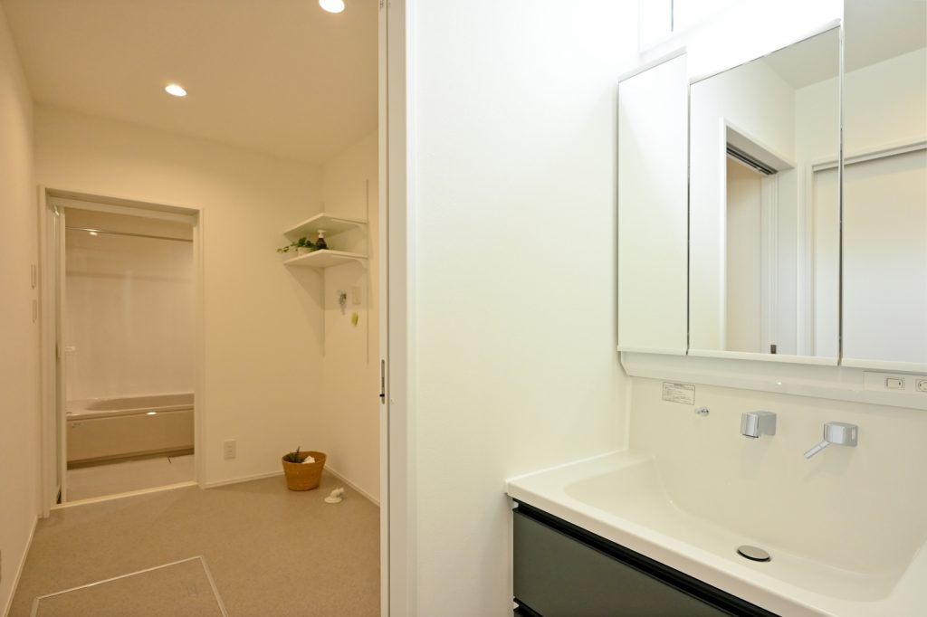 ▽洗面台と脱衣室を扉で仕切っているので家族の入浴時間がずれていても安心です