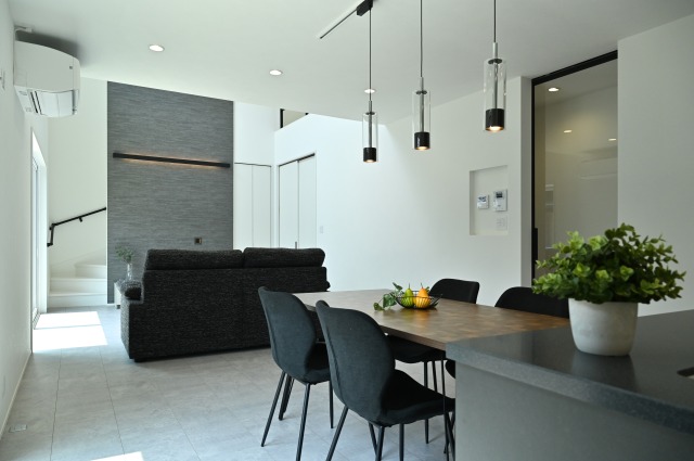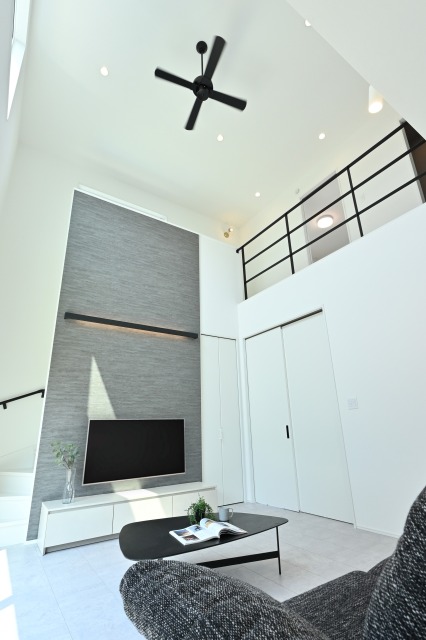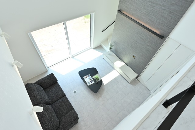 自然光がたっぷり入る吹き抜けで、家族が心地よく集まる開放的リビング