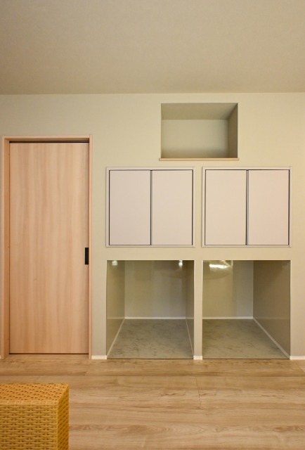 ▽2匹のワンちゃんそれぞれに専用スペースを造作。壁には汚れを拭き取りやすいキッチンパネルを採用
