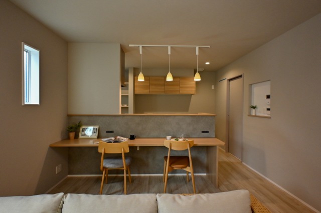 ▽グレージュの壁紙に、明るい木目がやさしく際立つダイニングカウンター