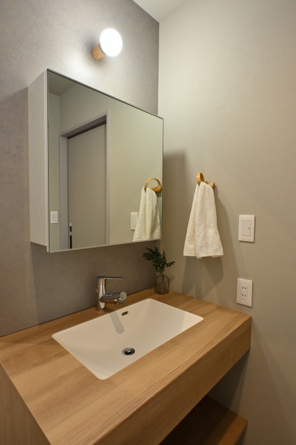 ▽照明や小物のバランスに心を配り、木の質感を楽しめる造作洗面台