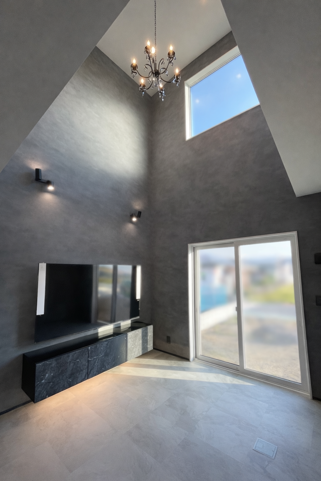 ▽吹き抜けにシャンデリアが映える、グレー×白×黒でまとめた洗練されたリビング