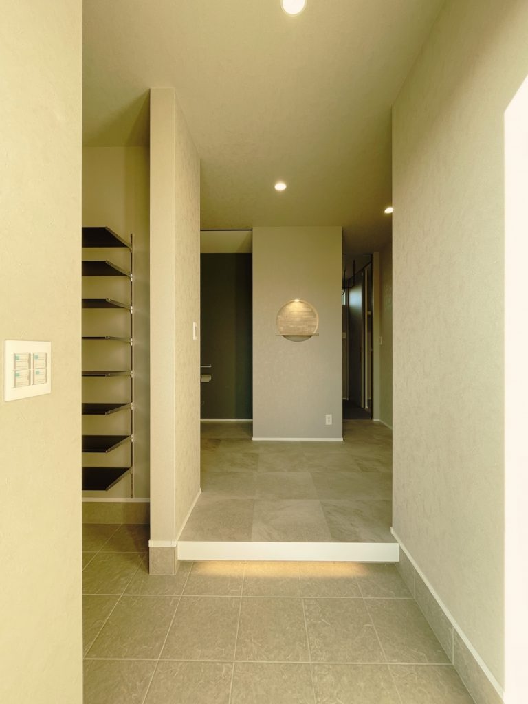 ▽やわらかな丸ニッチが目を引く、温もりのある開放的な玄関