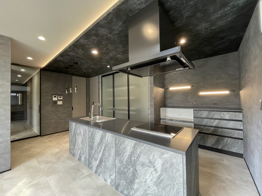 ▽重厚感のある素材と光の演出が美しい、ホテルライクなアイランドキッチン