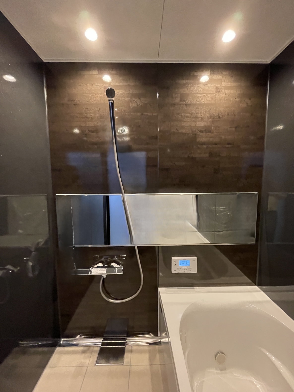 ▽ ブラウンでまとめた、落ち着きある空間とお手入れのしやすさを両立した浴室