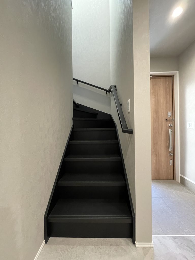 ▽玄関横に映える、スクエア手すりが印象的なブラック階段