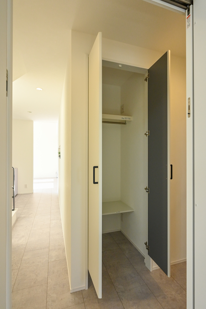 ▽玄関からランドリールームへの裏動線に、バッグやコートなどを掛けることのできる収納とルンバ基地も完備しました!